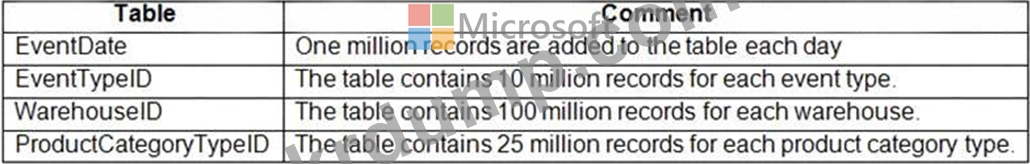 Azure Synapse Analytics 전용 SQL 풀에서 인벤토리 업데이트 테이블을 디자인하고 있습니다. 테이블에는 클러스터형 columnstore 인덱스가 있고 다음 열이 포함됩니다.