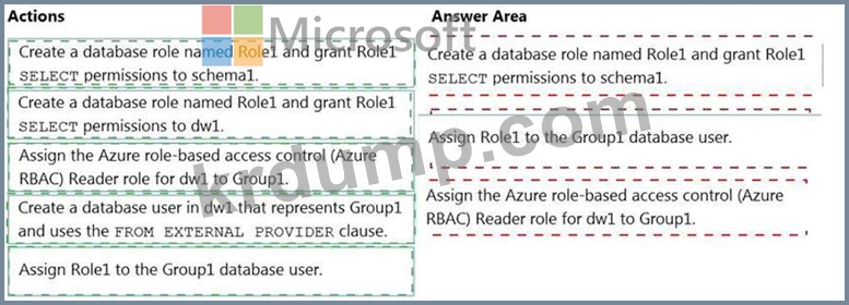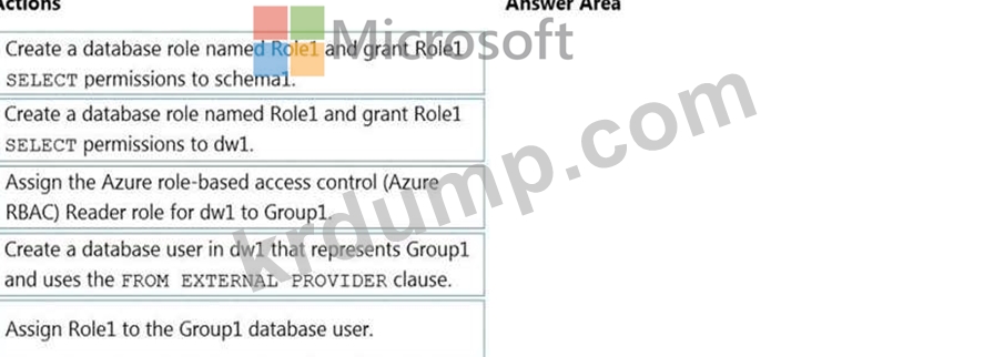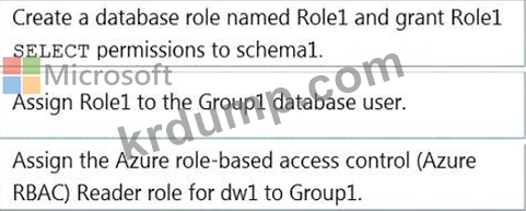 Group1이라는 보안 그룹이 포함된 Azure AD(Azure Active Directory) 테넌트가 있습니다. schema1이라는 스키마가 포함된 dw1이라는 Azure Synapse Analytics 전용 SQL 풀이 있습니다.
