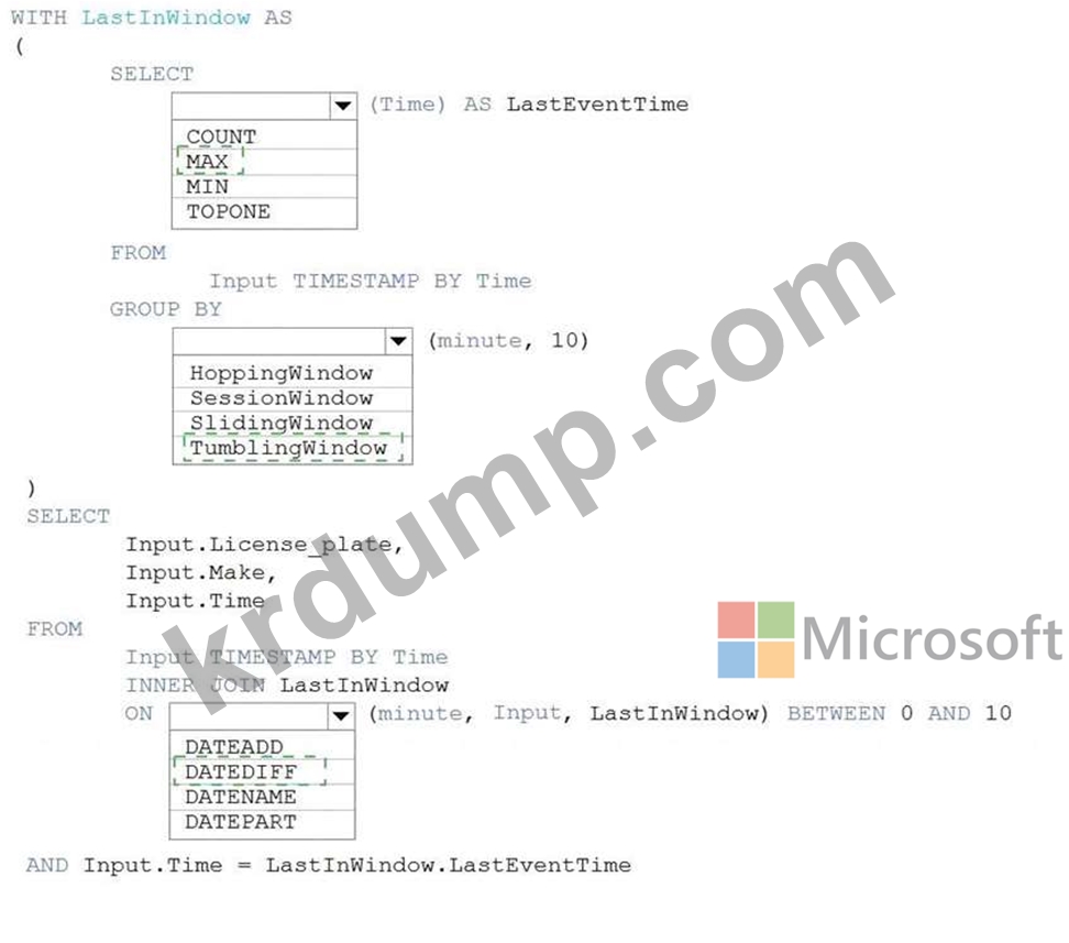 Azure Stream Analytics를 사용하여 각 10분 기간 동안 번호판, 차량 제조업체 및 마지막 차량이 지나간 시간을 반환해야 합니다.