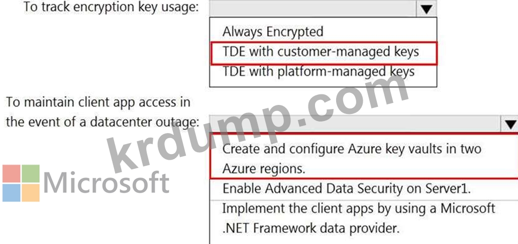 Server1용 TDE(투명한 데이터 암호화) 솔루션을 권장해야 합니다. 솔루션은 다음 요구 사항을 충족해야 합니다.