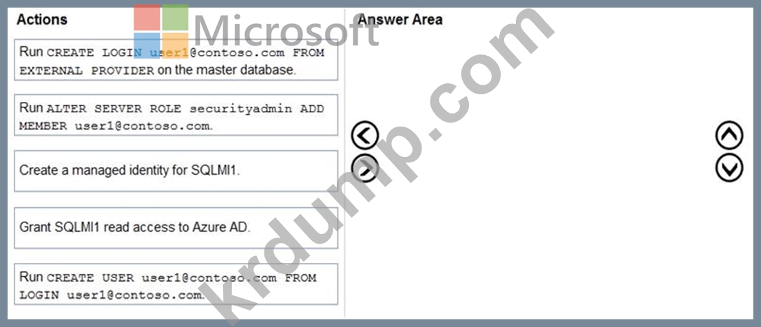 [email protected]이라는 사용자와 SQLMI1이라는 Azure SQL 관리형 인스턴스를 포함하는 contoso.com이라는 Azure AD(Azure Active Directory) 테넌트가 있습니다.