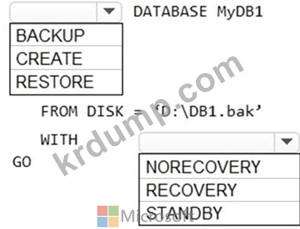 Windows Server 2019를 실행하는 VM1 및 VM2라는 두 개의 Azure 가상 머신이 있습니다. VM1 및 VM2는 각각 기본 Microsoft SQL Server 2019 인스턴스를 호스팅합니다. VM1에는 D:\DB1.bak이라는 파일에 백업되는 DB1이라는 데이터베이스가 있습니다.
