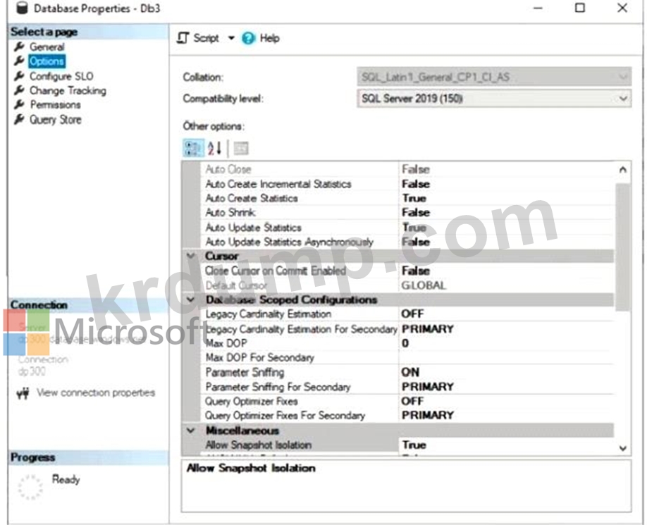 전시회에 표시된 대로 Microsoft SSMS(SQL Server Management Studio)에서 DB3의 속성을 볼 수 있는 기능을 DevUser라는 사용자에게 제공해야 합니다. (전시 탭을 클릭하세요.)