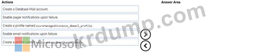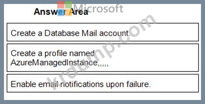 SQL1이라는 새 Azure SQL 관리형 인스턴스를 생성하고 데이터베이스 메일 확장 저장을 활성화합니다. SQL 1에서 실행되는 SQ 서버 에이전트 작업이 오류가 발생할 때 이를 알릴 수 있는지 확인해야 합니다. 답변을 위해 시퀀스 7에서 수행해야 하는 세 가지 작업은 무엇입니까? 작업 목록에서 해당 작업을 답변 영역으로 이동하고 올바른 순서로 정렬합니다.