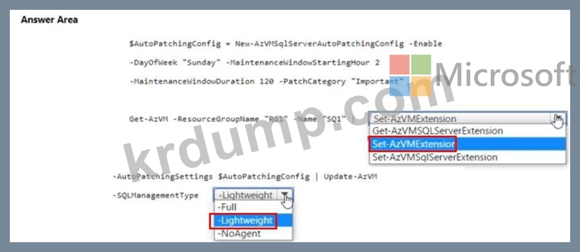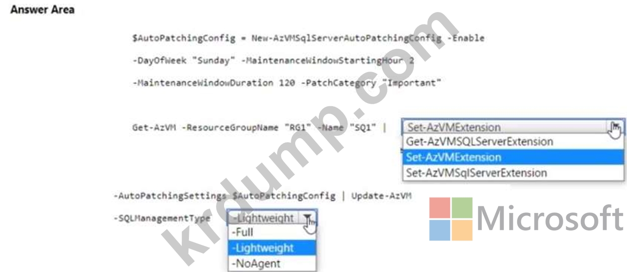 RG1이라는 리소스 그룹을 포함하는 Azure 구독이 있습니다. RG1에는 SQL이라는 Azure Virtual Machines의 SQL Server 인스턴스가 포함되어 있습니다. SQL에 대한 자동화된 패치를 활성화하고 구성하려면 PowerShell을 사용해야 합니다. 솔루션에는 SQL Server 및 Windows 보안 업데이트가 모두 포함되어야 합니다.
