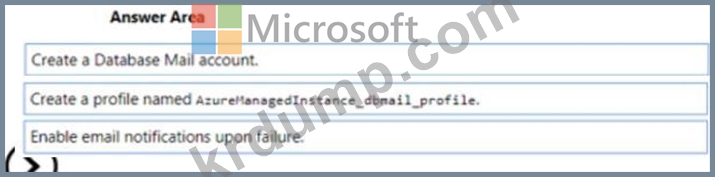 SQL1이라는 새 Azure SQL 관리형 인스턴스를 생성하고 데이터베이스 메일 확장 저장을 활성화합니다. SQL 1에서 실행되는 SQ 서버 에이전트 작업이 오류가 발생할 때 이를 알릴 수 있는지 확인해야 합니다. 답변을 위해 시퀀스 7에서 수행해야 하는 세 가지 작업은 무엇입니까? 작업 목록에서 해당 작업을 답변 영역으로 이동하고 올바른 순서로 정렬합니다.