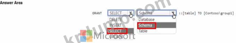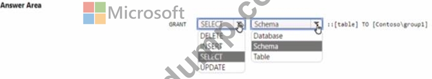 Group1이라는 그룹과 081이라는 데이터베이스를 호스팅하는 Azure SQL 관리형 인스턴스를 포함하는 Azure 구독이 있습니다. 그룹 1에 m 06I 생성된 새 테이블에 대한 읽기 액세스 권한이 있는지 확인해야 합니다. 솔루션은 최소 권한 원칙을 사용해야 합니다. Transact-SQL 문을 완성해야 합니까?' 대답하려면 대답에서 적절한 옵션을 선택하십시오. 참고: 올바른 선택은 각각 1점의 가치가 있습니다.