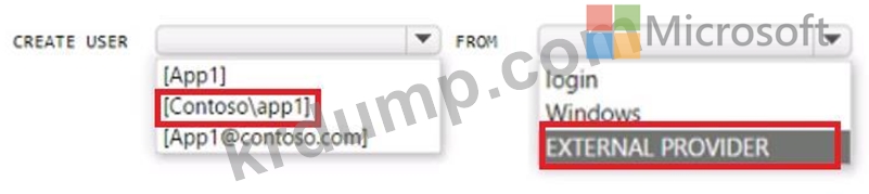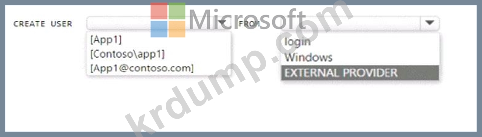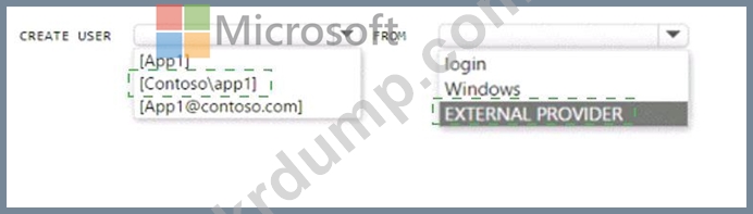 contoso.com이라는 Azure AD 테넌트에 연결된 Azure 구독이 있습니다. 구독에는 SQL 1이라는 Azure SQL 데이터베이스와 app1이라는 Azure 웹이 포함되어 있습니다. App1에는 관리 ID 기능이 활성화되어 있습니다.