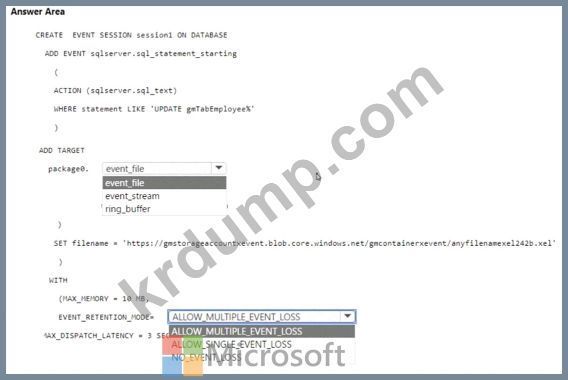 Azure Virtual Machines에서 SQL Server 인스턴스가 포함된 Azure 구독이 있습니다. 가상 머신은 DB1이라는 데이터베이스를 호스팅합니다. 확장 이벤트를 사용하여 DB1을 모니터링해야 합니다. 솔루션은 다음 요구 사항을 충족해야 합니다.