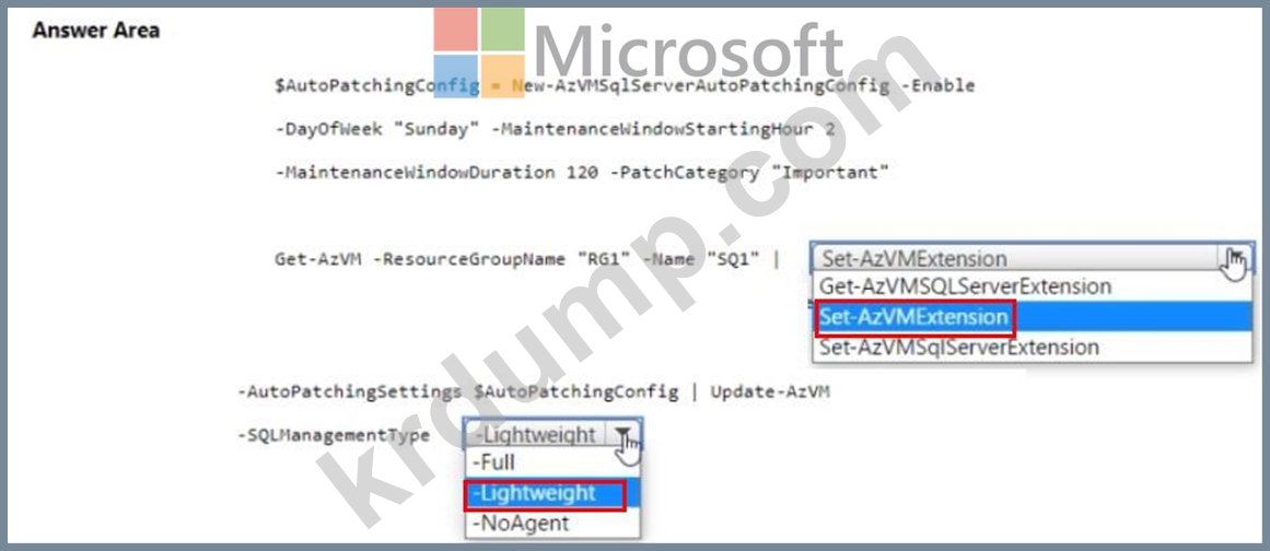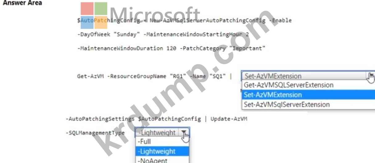 RG1이라는 리소스 그룹이 포함된 Azure 구독이 있습니다. RG1에는 Azure Virtual Machines에 SQL이라는 SQL Server 인스턴스가 포함되어 있습니다. PowerShell을 사용하여 SQL에 대한 자동 패치를 활성화하고 구성해야 합니다. 솔루션에는 SQL Server 및 Windows 보안 업데이트가 모두 포함되어야 합니다.