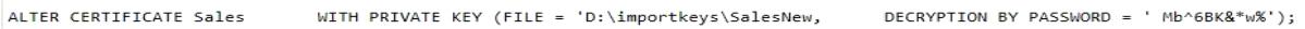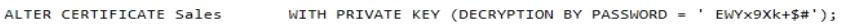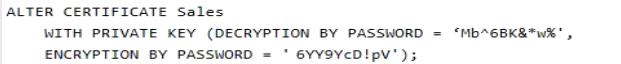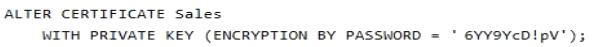Sales라는 개인 인증서가 포함된 DB1이라는 Azure SQL 데이터베이스가 있습니다. Sales의 개인 키는 암호로 암호화되어 있습니다. 개인 키의 암호를 변경해야 합니다. 어떤 Transact-SQL 문을 실행해야 할까요?
