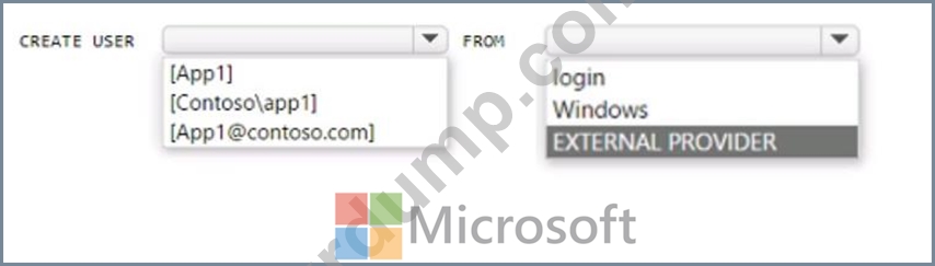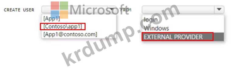 contoso.com이라는 Azure AD 테넌트에 연결된 Azure 구독이 있습니다. 이 구독에는 SQL 1이라는 Azure SQL 데이터베이스와 app1이라는 Azure 웹이 포함되어 있습니다. App1에는 관리 ID 기능이 활성화되어 있습니다.
