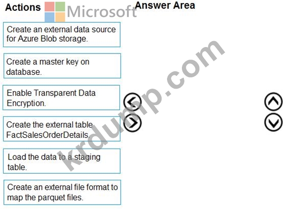 Azure Blob 저장소에서 Parquet 형식으로 저장된 데이터를 검색하여 FactSalesOrderDetails라는 큰 테이블에 로드하려면 PolyBase를 사용해야 합니다.