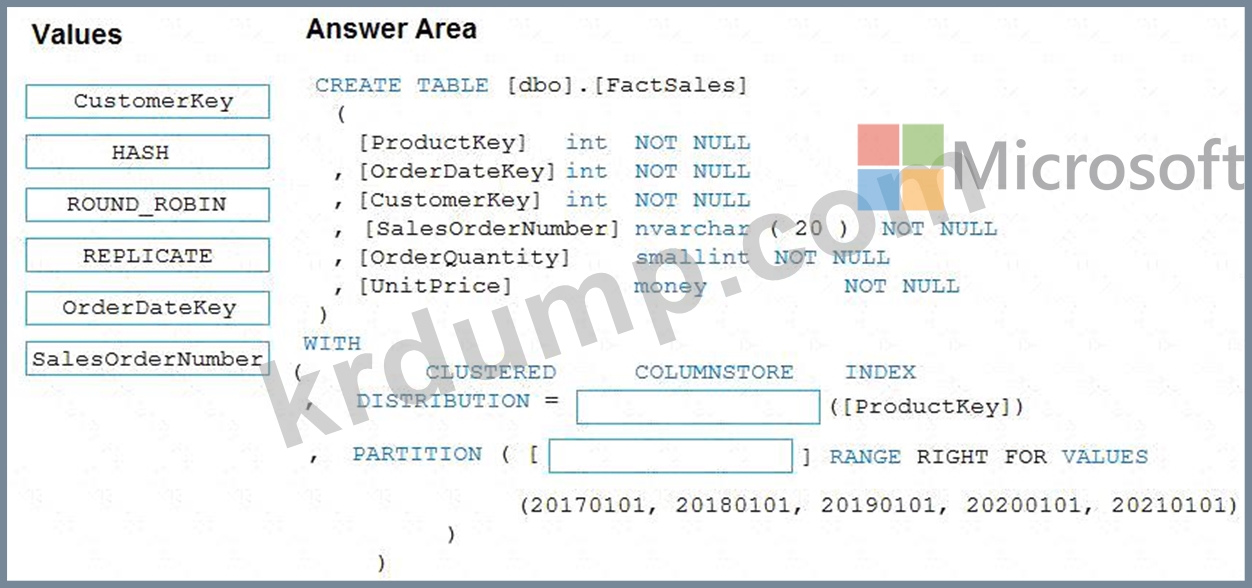Transact-SQL 문을 어떻게 완성해야 할까요? 답을 얻으려면 적절한 값을 올바른 대상에 끌어다 놓으세요. 각 값은 한 번, 여러 번 또는 전혀 사용되지 않을 수 있습니다.