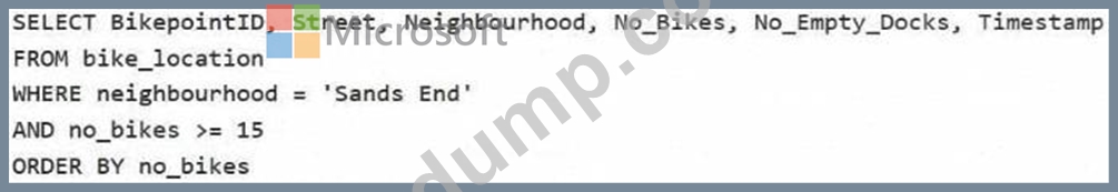 데이터를 사용할 수 있도록 준비하려면 변환 및 필터 논리를 적용해야 합니다. 솔루션은 No_Bikes가 15 이상일 때 Sands End라는 동네에 대한 데이터를 반환해야 합니다. 결과는 No_Bikes를 기준으로 오름차순으로 정렬되어야 합니다.