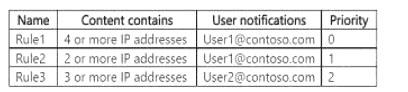 다음 표에 표시된 고급 DLP 규칙이 포함된 DLP1이라는 데이터 유출 방지(DLP) 정책을 만듭니다.