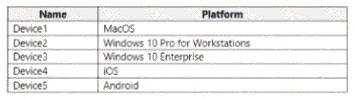 모바일 기기 관리에 등록된 기기를 포함하는 Microsoft 365 테넌트가 있습니다. 기기는 다음 표에 표시된 대로 구성됩니다.