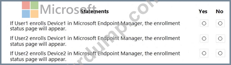 OOBE(Out-of-Box Experience)로 프로비저닝된 장치에만 페이지 표시: 아니요 할당: 그룹 2 다음 각 문장에 대해 문장이 참이면 예를 선택합니다. 그렇지 않으면 아니요를 선택합니다.
