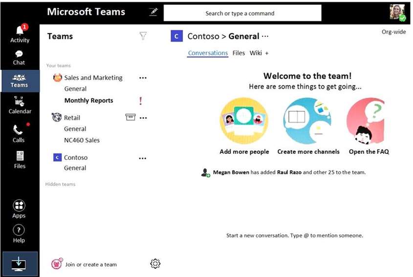Microsoft Teams 클라이언트에서 전시회에 표시된 팀을 검토합니다. (전시 탭을 클릭하세요.)