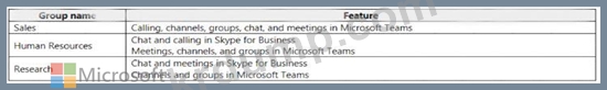 그룹을 기반으로 단계적으로 Microsoft Teams로 업그레이드할 계획입니다. 각 그룹에 필요한 기능은 다음 표와 같습니다.