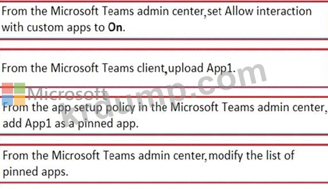 App1을 배포해야 합니다. 솔루션은 App1이 Microsoft Teams 클라이언트의 앱 표시줄에 첫 번째 항목으로 나타나도록 해야 합니다.