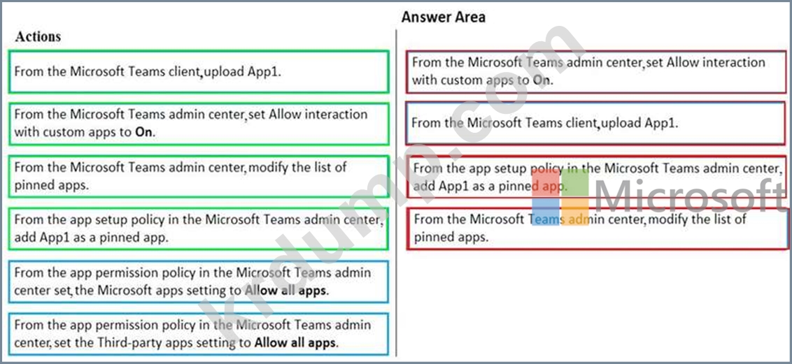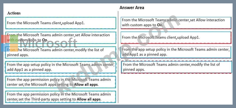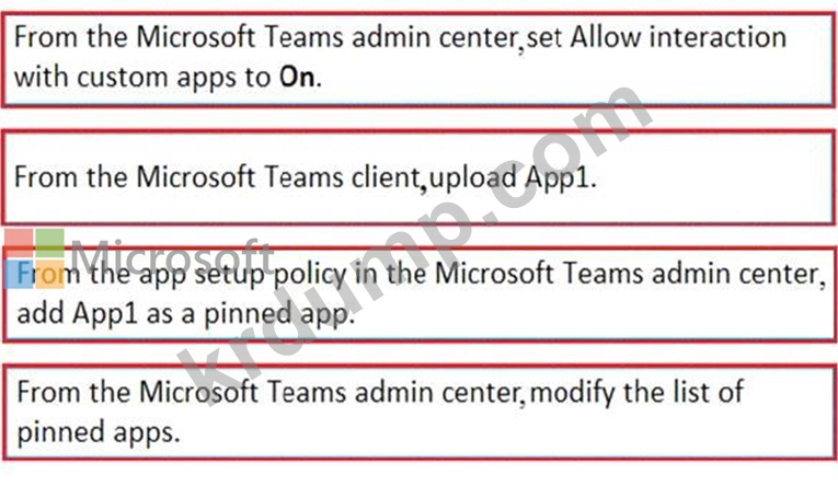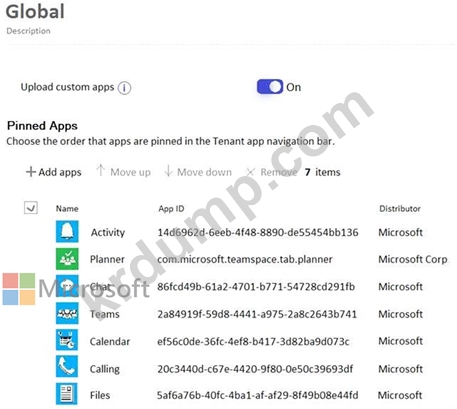 App1을 배포해야 합니다. 솔루션은 App1이 Microsoft Teams 클라이언트의 앱 표시줄에 첫 번째 항목으로 나타나도록 해야 합니다.