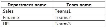 회사에는 다음 표와 같은 부서 및 팀이 있습니다.