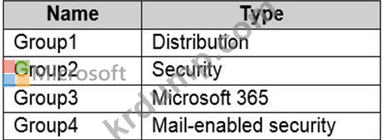 Azure AD(Azure Active Directory) 테넌트에 연결된 Microsoft 365 E5 구독이 있습니다. 테넌트는 다음 표에 표시된 그룹을 포함합니다.