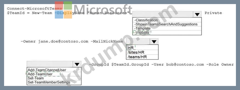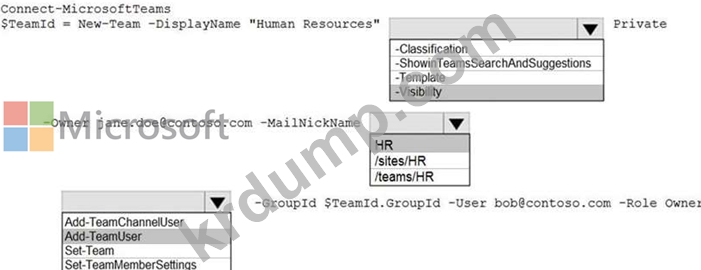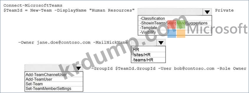 다음 요구 사항을 충족하는 Human Resources라는 새 Microsoft Teams 팀을 만들어야 합니다.