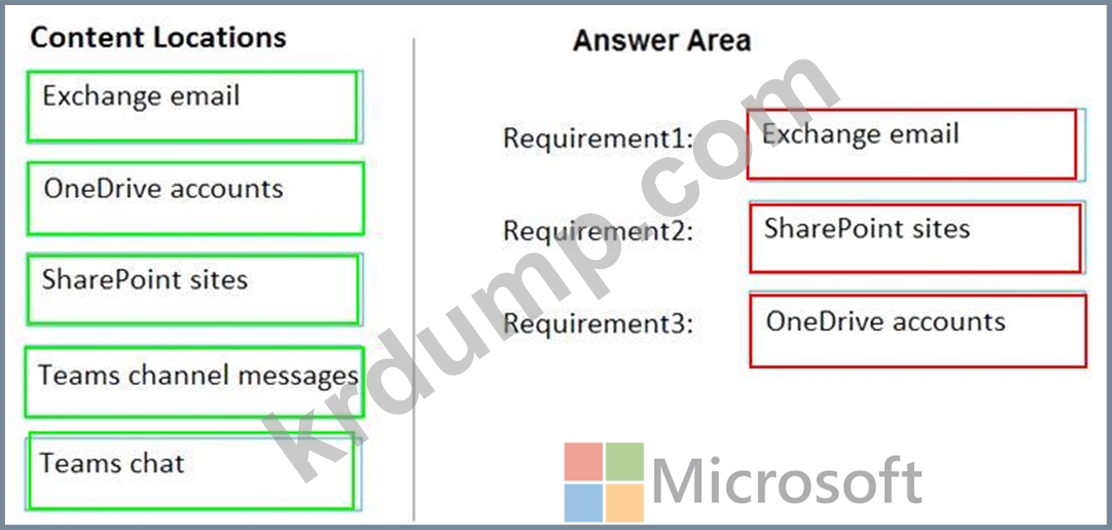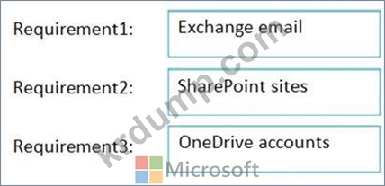 보존 정책에 어떤 콘텐츠 위치를 포함해야 합니까? 응답하려면 적절한 콘텐츠 위치를 올바른 요구 사항으로 드래그하십시오. 각 콘텐츠 위치는 한 번, 두 번 이상 사용하거나 전혀 사용하지 않을 수 있습니다.