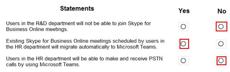 다음 표에 나와 있는 공존 모드를 사용하여 회사 R&D 및 HR(인적 자원) 부서의 사용자 계정에 TeamsUpgradePolicy를 적용합니다.