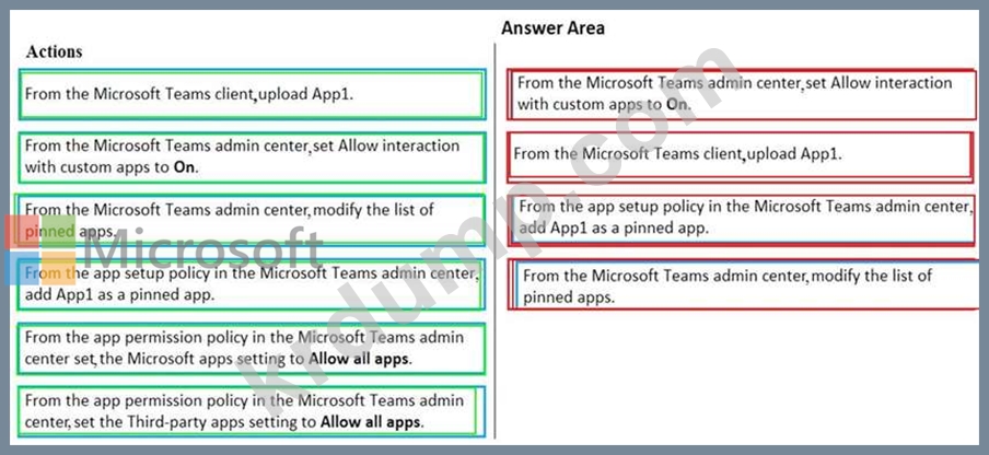 App1을 배포해야 합니다. 솔루션은 App1이 Microsoft Teams 클라이언트의 앱 표시줄에 첫 번째 항목으로 나타나도록 해야 합니다.