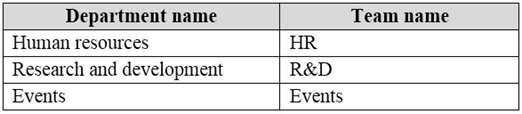 회사에는 다음 표에 표시된 부서 및 팀이 있습니다.