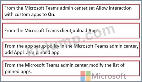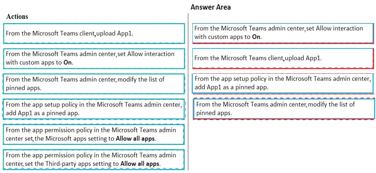 App1을 배포해야 합니다. 솔루션은 App1이 Microsoft Teams 클라이언트의 앱 바에 첫 번째 항목으로 나타나도록 해야 합니다.