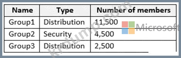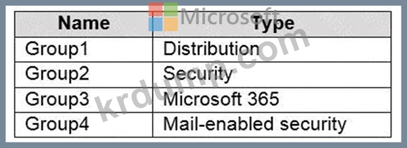 Azure Active Directory(Azure AD) 테넌트에 연결된 Microsoft 365 E5 구독이 있습니다. 해당 테넌트에는 다음 표에 나와 있는 그룹이 포함되어 있습니다.