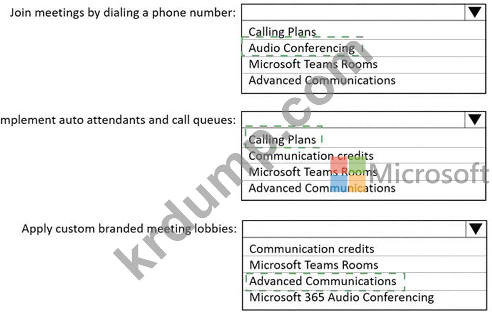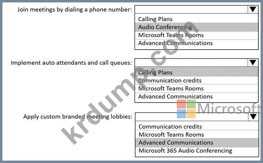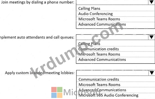 각 요구 사항에 맞게 어떤 Microsoft Teams 기능을 구성해야 할까요? 답변하려면 답변 영역에서 적절한 옵션을 선택하세요.