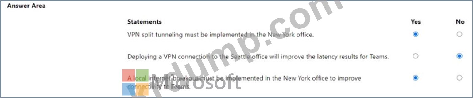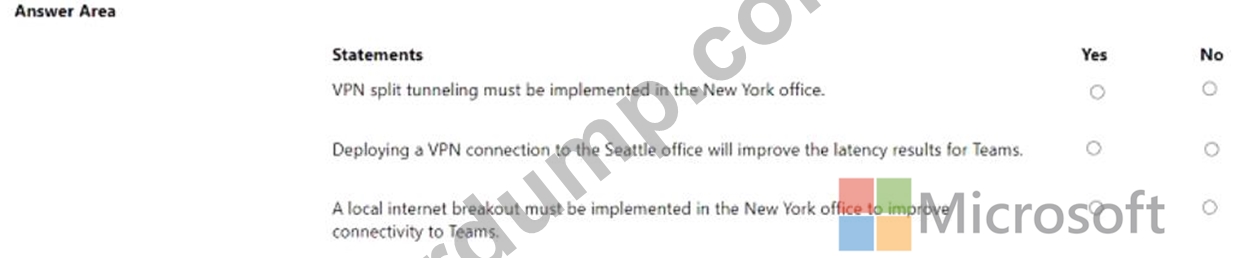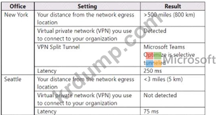 두 사무실 모두에서 Microsoft 365 네트워크 연결 테스트 도구를 실행하여 다음 표에 나온 결과를 얻었습니다.