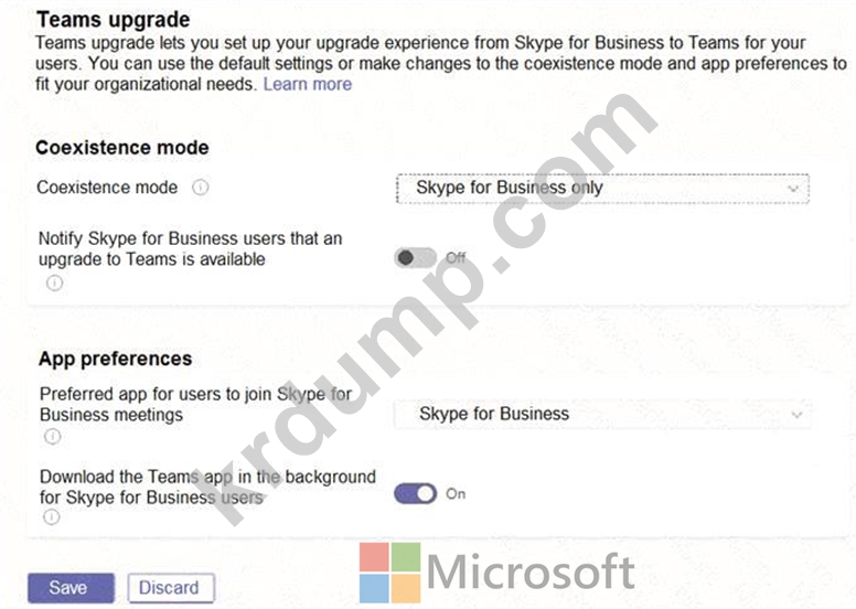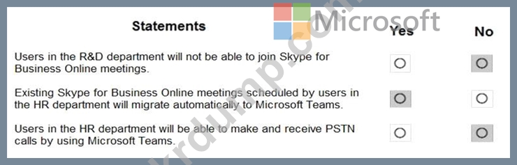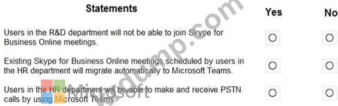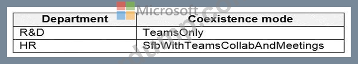 다음 표에 표시된 공존 모드를 사용하여 회사의 R&D 및 인사(HR) 부서의 사용자 계정에 TeamsUpgradePolicy를 적용합니다.