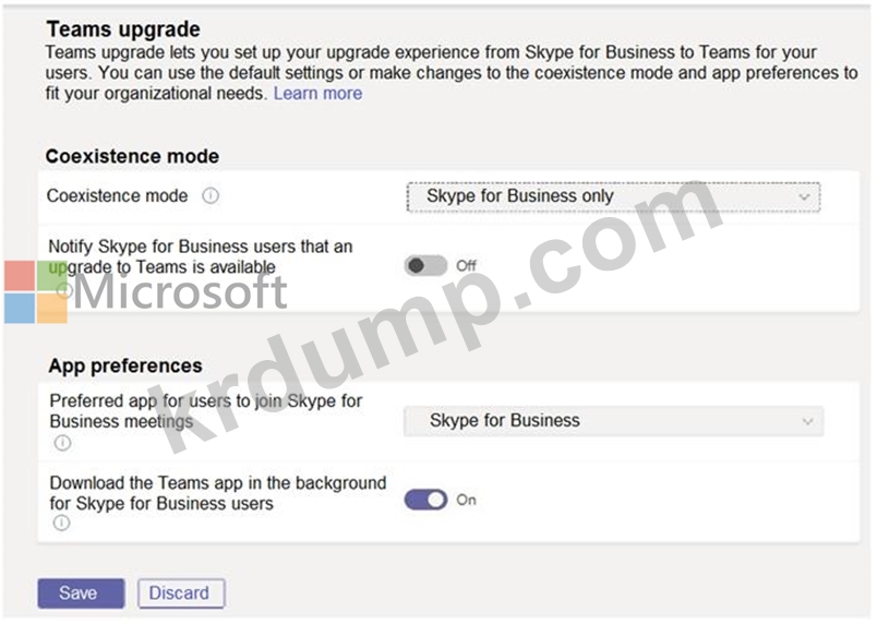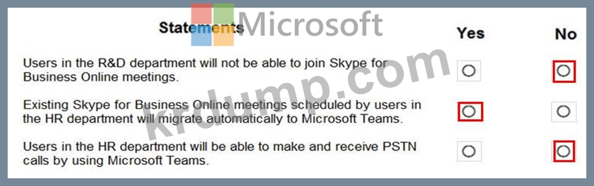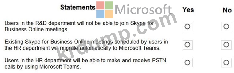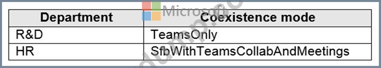 다음 표에 표시된 공존 모드를 사용하여 회사의 R&D 및 인사(HR) 부서의 사용자 계정에 TeamsUpgradePolicy를 적용합니다.