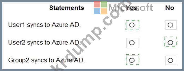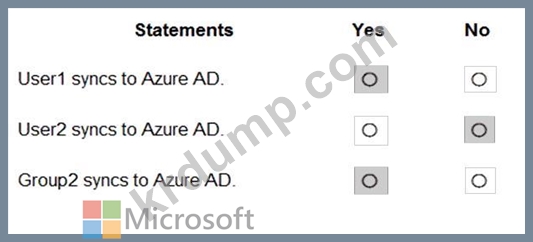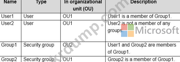 네트워크에 contoso.com이라는 온-프레미스 Active Directory 도메인이 있습니다. 이 도메인에는 다음 표에 나와 있는 개체가 포함되어 있습니다.