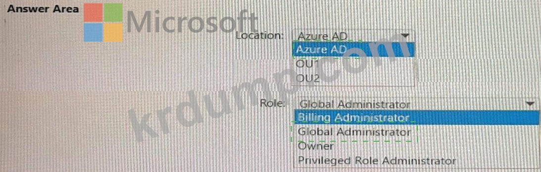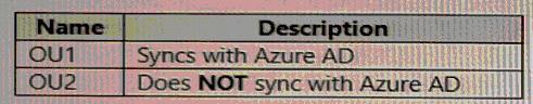네트워크에는 Azure AD 테넌트와 동기화되는 온-프레미스 Active Directory 도메인 서비스(AD DS) 도메인이 포함되어 있습니다. AD DS 도메인에는 다음 표에 나와 있는 조직 단위(OU)가 포함되어 있습니다.