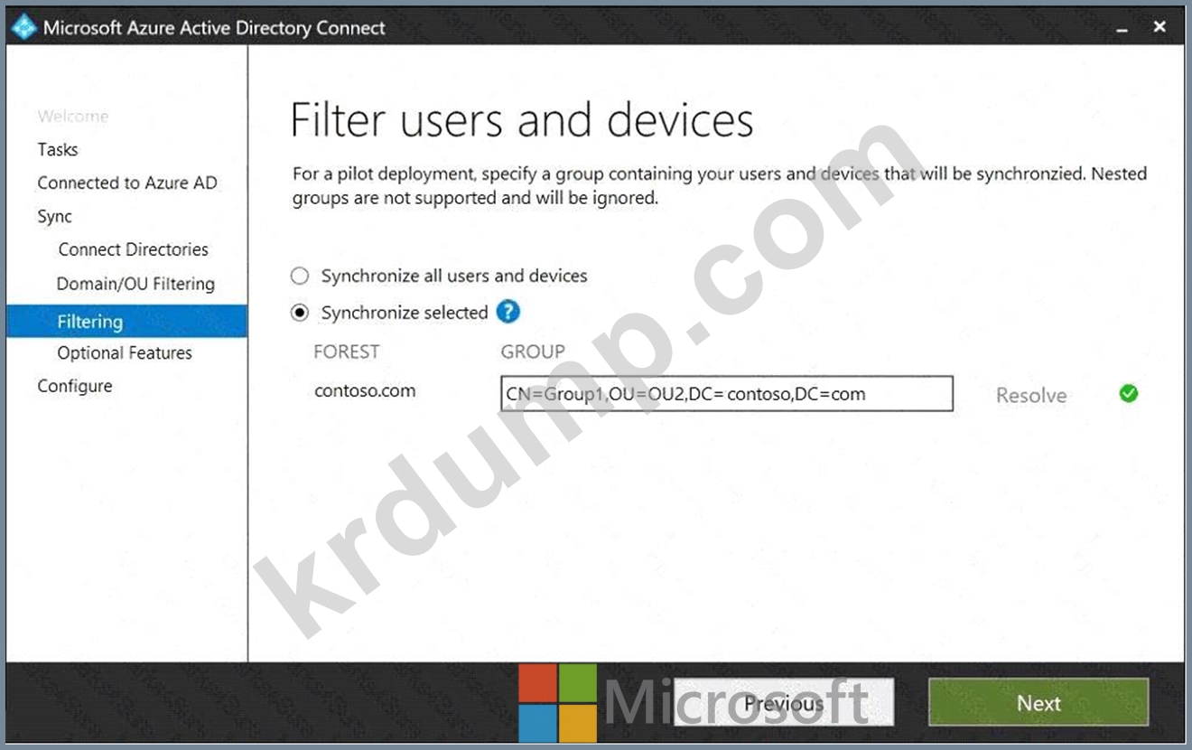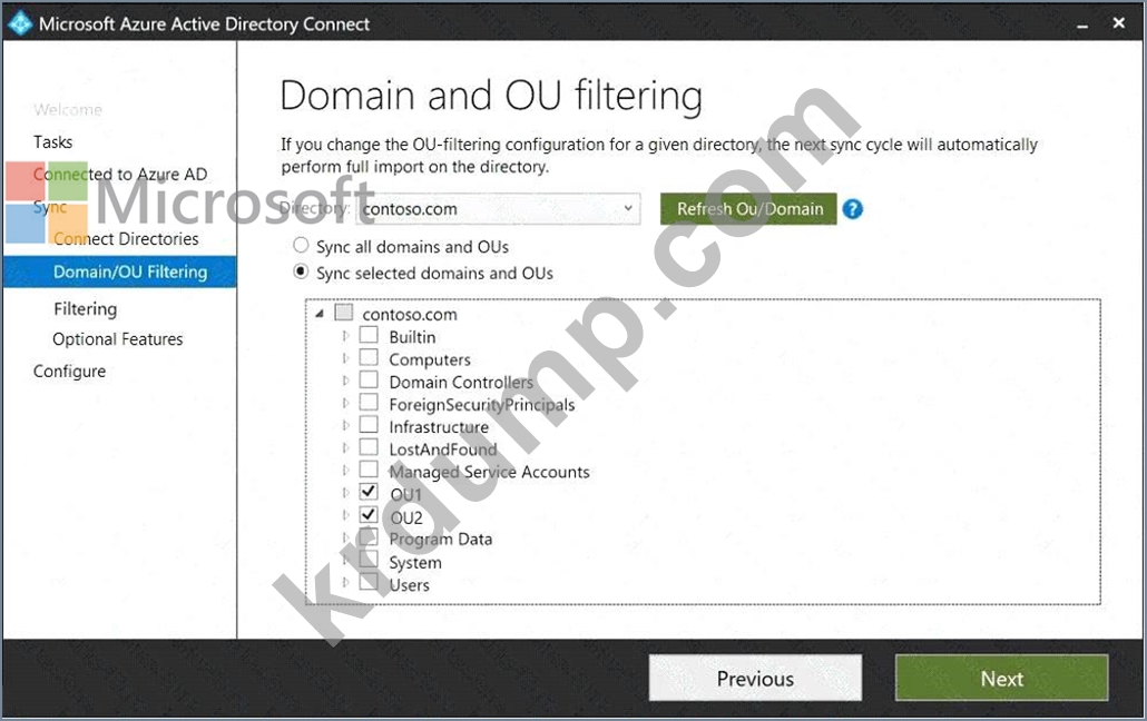 Azure AD Connect를 설치합니다. 도메인 및 OU 필터링 표에 표시된 대로 도메인 및 OU 필터링 설정을 구성합니다. (도메인 및 OU 필터링 탭을 클릭하세요.)