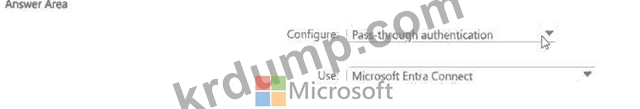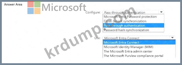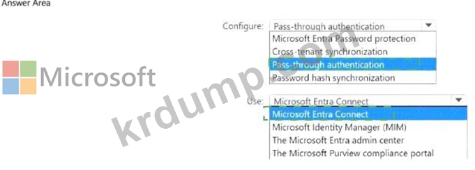 네트워크에 Microsoft Entra 테넌트와 동기화되는 온-프레미스 Active Directory 도메인 서비스(AD DS) 도메인이 있습니다. AD DS 도메인에 대해 암호의 유효성을 검사하여 사용자 인증을 항상 수행해야 합니다. 무엇을 구성하고 무엇을 사용해야 할까요? 답변하려면 답변 영역에서 적절한 옵션을 선택하세요. 참고: 각 선택 항목은 1점입니다.