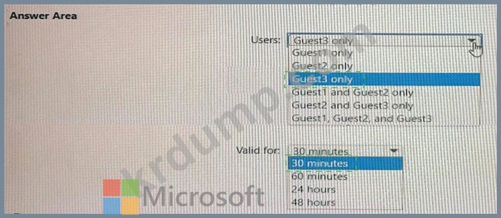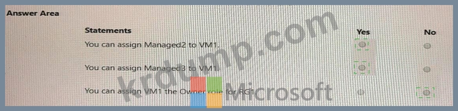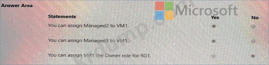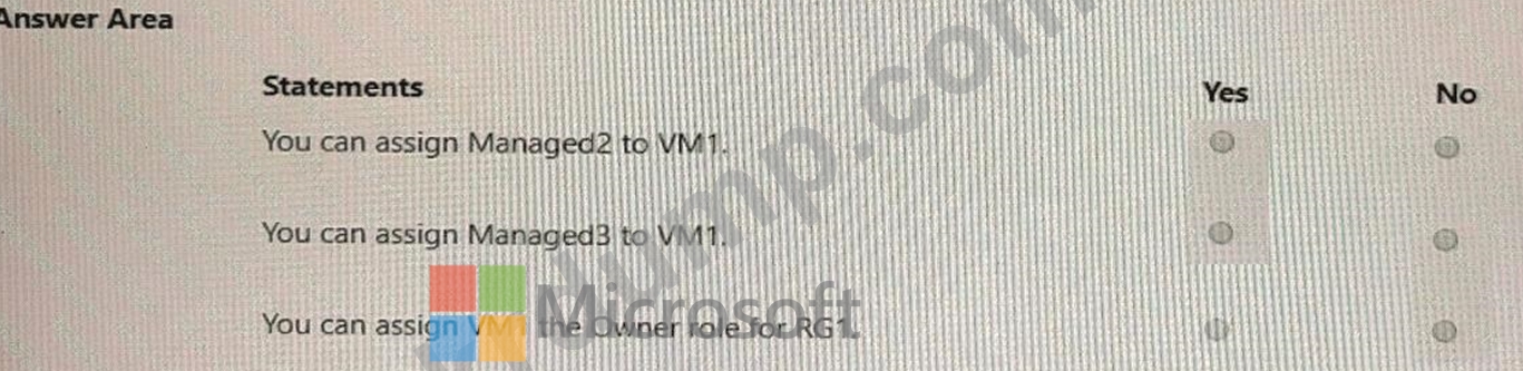 다음 가상 머신 이름을 포함하는 Azure 구독이 있습니다. 이름: VM1 Azure 지역: 미국 동부 시스템에서 할당한 관리 ID: 비활성화됨 다음 표에 표시된 관리 ID를 만듭니다.