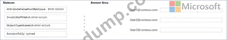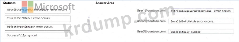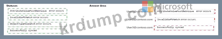 Microsoft Entra Connect 동기화는 각 사용자에게 어떤 동기화 상태를 반환할까요? 답을 얻으려면 해당 상태를 해당 사용자에게 드래그하세요. 각 상태는 한 번, 여러 번 또는 전혀 사용되지 않을 수 있습니다. 콘텐츠를 보려면 창 사이의 분할 막대를 드래그하거나 스크롤해야 할 수도 있습니다.