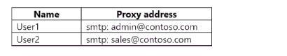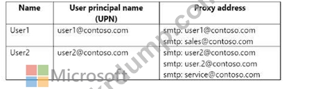 네트워크에는 Microsoft Entra Connect를 사용하여 Microsoft Entra 테넌트와 동기화되는 contoso.com이라는 온-프레미스 Active Directory 도메인이 있습니다. 이 도메인에는 다음 표에 나와 있는 사용자가 포함되어 있습니다.