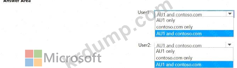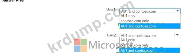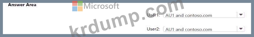 contoso.com이라는 Microsoft Entra 테넌트가 있으며, 이 테넌트에는 AU1이라는 관리 단위와 User1, User2라는 두 사용자가 있습니다. User1은 AU1의 구성원입니다.