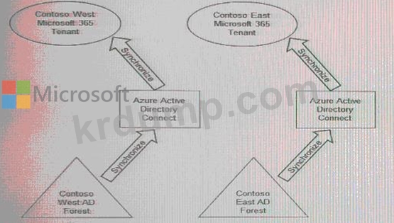 귀사에는 Contoso East와 Contoso West라는 두 개의 사업부가 있습니다. 두 사업부의 Microsoft 365 ID 아키텍처는 다음 전시에 나와 있습니다.