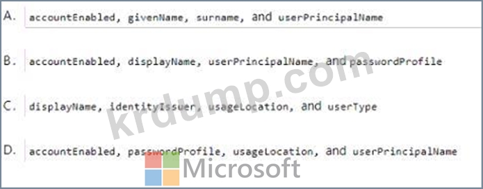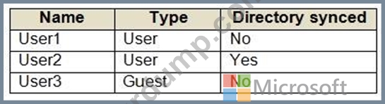 귀하의 네트워크에는 Azure Active Directory(Azure AD) 테넌트와 동기화되는 온프레미스 Active Directory 도메인이 포함되어 있습니다. 테넌트에는 다음 표에 표시된 사용자가 포함되어 있습니다.