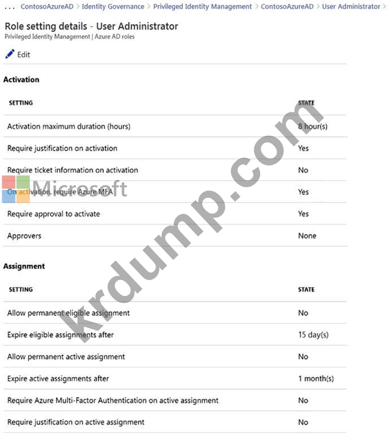 다음 그림과 같이 사용자 관리자 역할에 대한 Azure AD 권한 있는 ID 관리(PIM) 역할 설정이 포함된 Azure Active Directory(Azure AD) 테넌트가 있습니다.